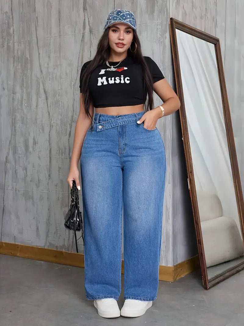 جينز نسائي واسع الساق بخصر عالي باللون الأزرق الفاتح